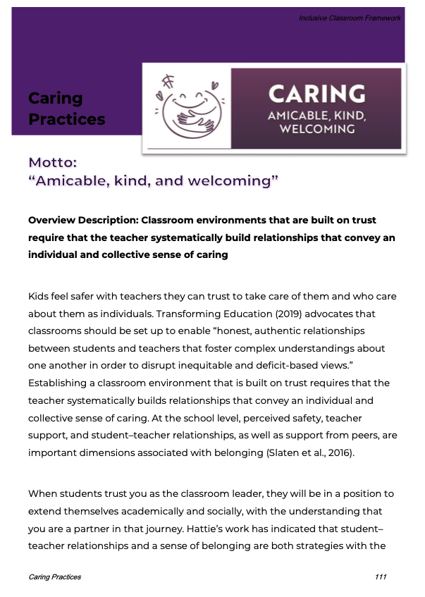 This eBook Mini that covers the Caring domain overview, practices, and success criteria from the larger Inclusive Classroom Framework: The Teacher's eBook (available at https://cultivatechris.gumroad.com/l/ICFeBook ).