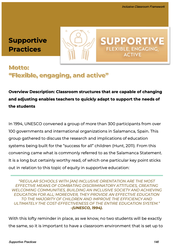 A wide range of unique skills, backgrounds, needs, and preferences enter the classroom every day. A supportive classroom is one that has structures that are capable of changing and adjusting based on this diversity of strengths and needs, which enables teachers to quickly adapt to support the students. These practices range from the direct instruction of academic, behavioral, and social-emotional skills to the usage of individual and group contingencies for classroom management.