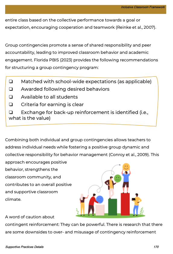 A wide range of unique skills, backgrounds, needs, and preferences enter the classroom every day. A supportive classroom is one that has structures that are capable of changing and adjusting based on this diversity of strengths and needs, which enables teachers to quickly adapt to support the students. These practices range from the direct instruction of academic, behavioral, and social-emotional skills to the usage of individual and group contingencies for classroom management.